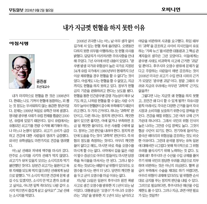 지난달 24일은 일본이 후쿠시마 원전 폭발 사고로 생긴 오염수를 방류한 지 1년이 되는 날이었다. 대통령실은 ‘오염수’가 아니라 오염수라는 ‘괴담’을 방류한 지 1년이 되는 날이라고 야당을 비판하며 사과를 요구했다. 취임 때부터 ‘과학’을 강조하고 사이비 지식인들이 유포하는 ‘가짜 뉴스’를 비판한 대통령과 그 핵심 관계자들의 생각은 그런 모양이다. 이들에게는 광우병 사태도 비과학적 사고에 근거한 ‘괴담’일 뿐이다. 후쿠시마 오염수 방류에 문제가 없다고 주장하는 사람들이 매번 강조하는 것이 2008년 미국산 쇠고기 수입 반대 시위의 근거가 되었던 ‘광우병 괴담’이다. 정말 그때의 우려와 지금의 우려에는 아무런 ‘과학적’ 근거도 없을까? 그렇다면 나는 지금껏 왜 헌혈을 하지 못했고, 조만간 왜 다시 할 수 있게 될까?