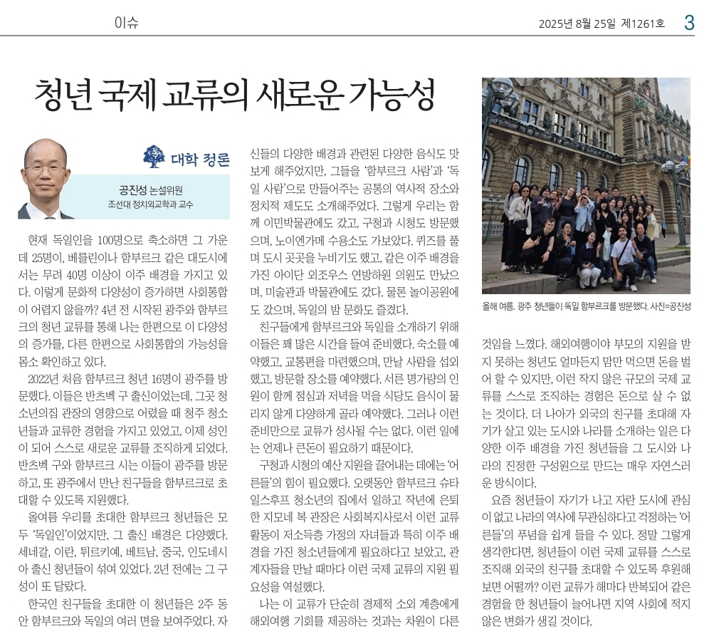 현재 독일인을 100명으로 축소하면 그 가운데 25명이, 베를린이나 함부르크 같은 대도시에서는 무려 40명 이상이 이주 배경을 가지고 있다. 이렇게 문화적 다양성이 증가하면 사회통합이 어렵지 않을까? 4년 전 시작된 광주와 함부르크의 청년 교류를 통해 나는 한편으로 이 다양성의 증가를, 다른 한편으로 사회통합의 가능성을 몸소 확인하고 있다.